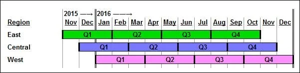 This month we step away from the Deadly Sins of Incentive Compensation to discuss a truly interesting suggestion about quota structure, from the Sales VP at one of our clients. At his company, regional sales quarters are staggered, so if there are, say, three regions in the company, each region’s quarters end in a different month. Here’s what that company’s quota quarters might look like for fiscal 2016 (with a 12/31 fiscal year):